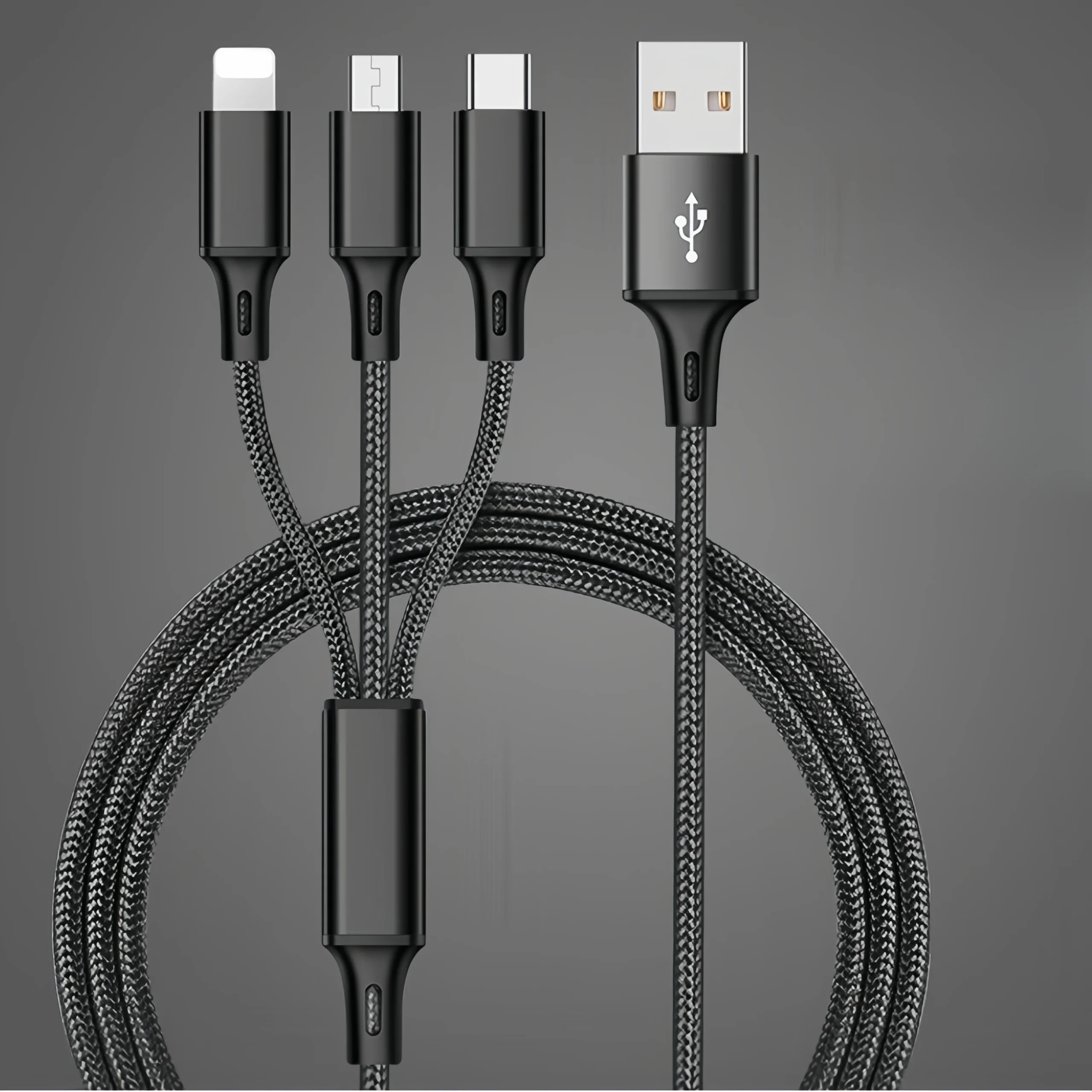 Features:* 3-in-1 Compatibility: Charges and syncs multiple devices with a single cable, reducing the need for multiple cables.*Durable Braided Nylon Construction: Strong and flexible, designed to withstand wear and tear, making it perfect for heavy use in vehicles and other environments.*Fast Charging & Data Sync: Supports quick charging and high-speed data transfer, ensuring your devices are always ready to go.