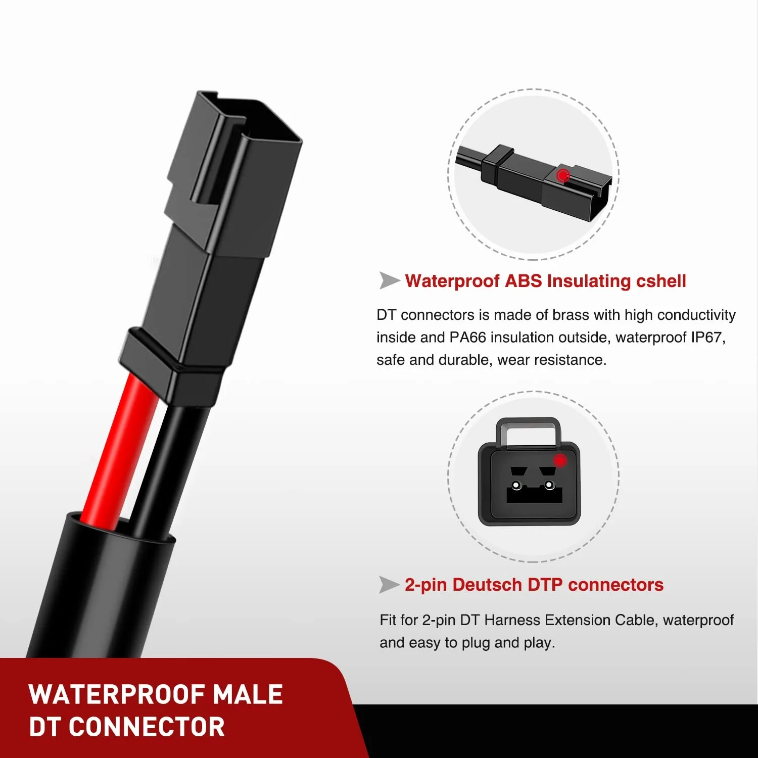 High-quality: The DT Wiring Harness Extension Kit made of 16 Gauge flexible strand copper wire, ABS 2-pin Socket, High quality PA66 nylon and PVC insulation tube protect the whole harness from overheat and can bear high temperature up to 120°C, make the extension Kit durable wear-resisting