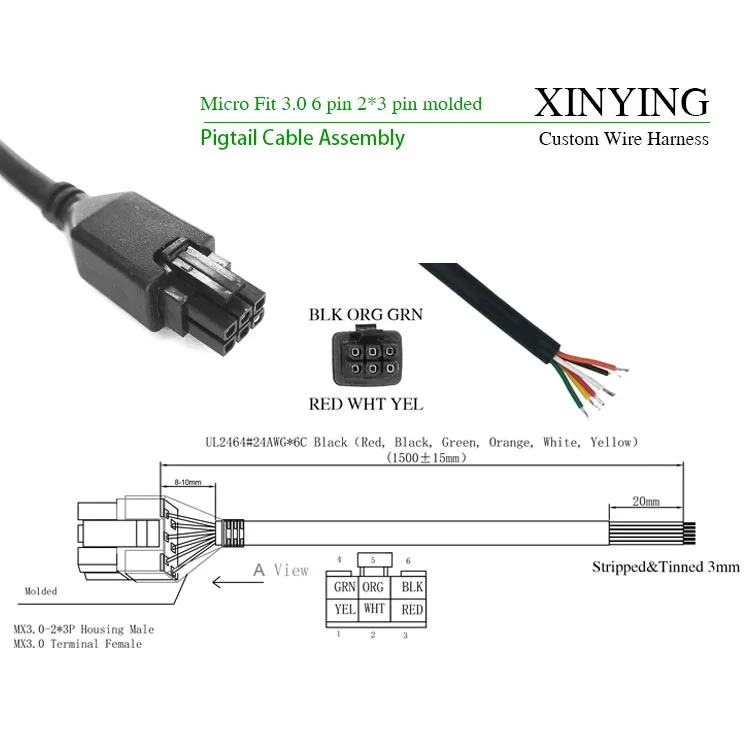Micro Fit 3.0 6 pin 2*3 pin molded to stripped tinned end pigtail cable wire harness compatible with Standard Molex 3.0mm Pitch connector 1.5m / 59 Inches Length
